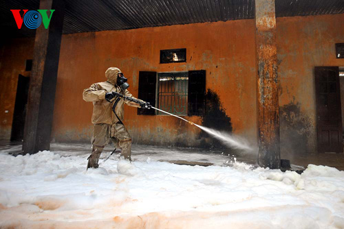 | កំលាំងជួយពន្លាក់អគ្គីភ័យកំពុងខំប្រឹងប្រែងពន្លាក់អគ្គីភ័យនៅរោងចក្រគីមី។ |