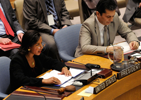 | ឯកអគ្គរដ្ឋទូតអាមេរិកប្រចំានៅអ.ស.ប Susan RIce (ស្តាំ) អានសេចក្តីប្រកាសប្រធានស្តីអំពីវិធានការដាក់ទណ្ឌកម្ម ចំពោះសាធារណរដ្ខប្រជាធិបតេយ្យប្រជាមានឹតកូរ៉េ (រូបថតៈ TTXVN) |