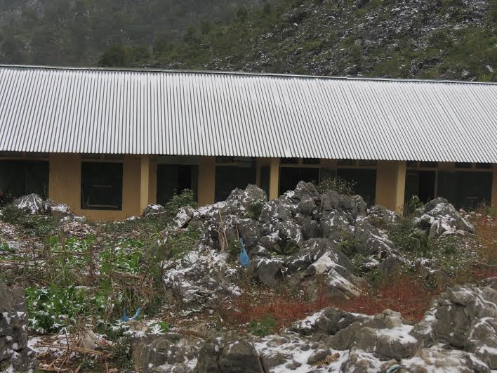 នៅឃុំ Can Chu Phin វាលស្រែ ដំបូលផ្ទះ និងភ្នំថ្មមានពណ៌សស្គុះ។វគ្គព្រិលធ្លាក់