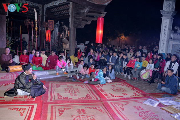 សិល្បករ ចម្រៀង Xoan វ័យក្មេងមួយរូប បានសំដែងនៅទីធ្លាសាលាភូមិ។