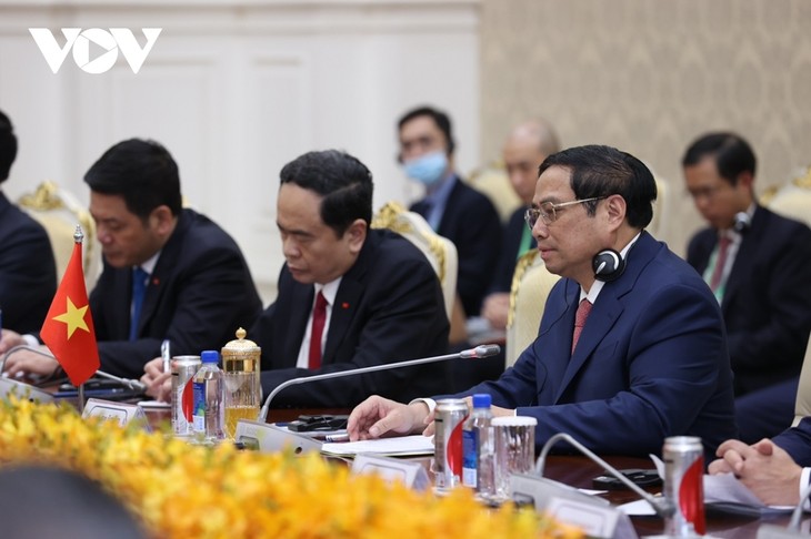 បន្ទាប់ពីពិធីស្វាគមន៍យ៉ាងឱឡារិក នៅវិមានសន្តិភាព រាជធានីភ្នំពេញ ព្រះរាជាណាចក្រកម្ពុជា នាយករដ្ឋមន្រ្តីលោក Pham Minh Chinh បានជួបពិភាក្សាការងារជាមួយ សម្តេចតេជោ ហ៊ុន សែន នាយករដ្ឋមន្រ្តីកម្ពុជា។