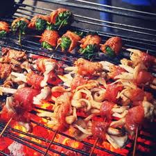 អ្នកហូបអង្គុយនៅក្បែរចង្រ្កានធ្យូងនិងអាំងម្ហូបនានា។អាំងម្ហូបសាយភាយក្លិនដ៍ឈ្ងុយ