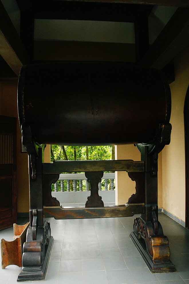 | នៅខាងស្តាំព្រះវិហារគឺ Lau Trong (ស្គរ)។ ស្គរនេះធ្វើដោយដើមខ្នោរព្រៃនៅខេត្ត Gia Lai ។ នៅខាងឆ្វេងគឺ Lau Chuong (កណ្តឹង)។ កណ្តឹងនេះមានទម្ងន់២តោនដែលបានចាក់ពីភូមិរបរប្រពៃណីល្បីឈ្មោះមួយនៅក្រុង Hue។ |