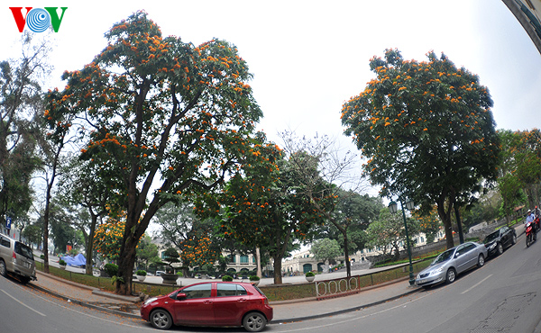 មិនត្រឹមតែ ព័ណ៍ខៀវខ្ចីនៃដើមឈើទើបនឹងលស់ត្រួយ ប៉ុណ្ណោះទេ បណ្ដាវិថីនៅ ទីក្រុងហាណូយត្រូវបាន តូបតែងដោយព័រណ៍លឿងរបស់ផ្ការាំង ទៀតផង។