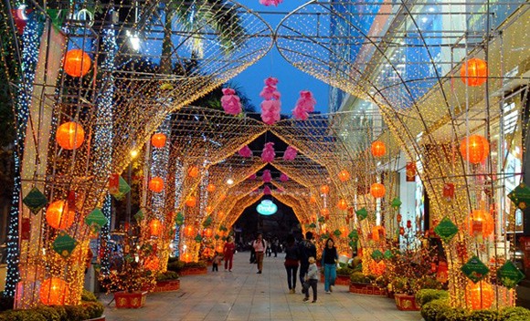 | ចញ្ចើមផ្លូវនៅមណ្ឌលពាណិជ្ជកម្ម Vincom ត្រូវបានតុបតែងដោយអំពូលអំពូល អគ្គិសនីចម្រះព័រ ។ |