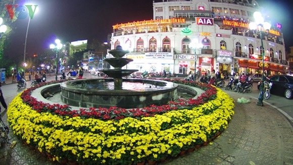 | ស្តូបបាញ់ទឹកនៅបឹង Hoan Kiem ត្រូវបានតុបតែងដោយផ្កាស្រស់។ |