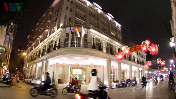 | វិថី Trang Tien ដ៏ត្រចះត្រចង់ក្រោមរសី្មពន្លឺអំពូល។ |