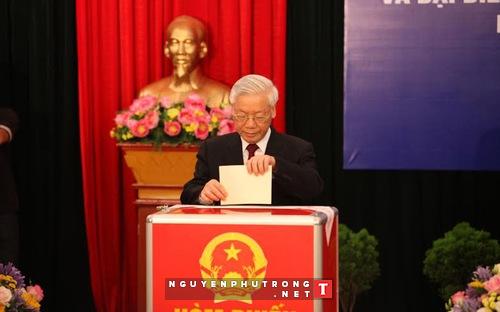 អគ្គលេខាបក្សកម្មុយនិស្តវៀតណាម លោក Nguyen Phu Trong បានអញ្ជើញទៅបោះ ឆ្នោតនៅមណ្ឌលបោះឆ្នោតលេខទី ៣ សង្កាត់ Nguyen Du ខ័ណ្ឌ Hai Ba Trung ទីក្រុង ហាណូយ។