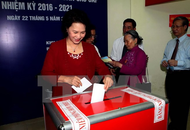 ប្រធានរដ្ឋសភាវៀតណាមនិងជាប្រធានក្រុមប្រឹក្សាជាតិរៀបចំការបោះឆ្នោត លោកស្រី Nguyen Thi Kim Ngan បានអញ្ជើញទៅបោះឆ្នោតនៅមណ្ឌលបោះឆ្នោតលេខទី ៤ សង្កាត់ Vinh Phuc ខ័ណ្ឌ Ba Dinh ទីក្រុងហាណូយ។