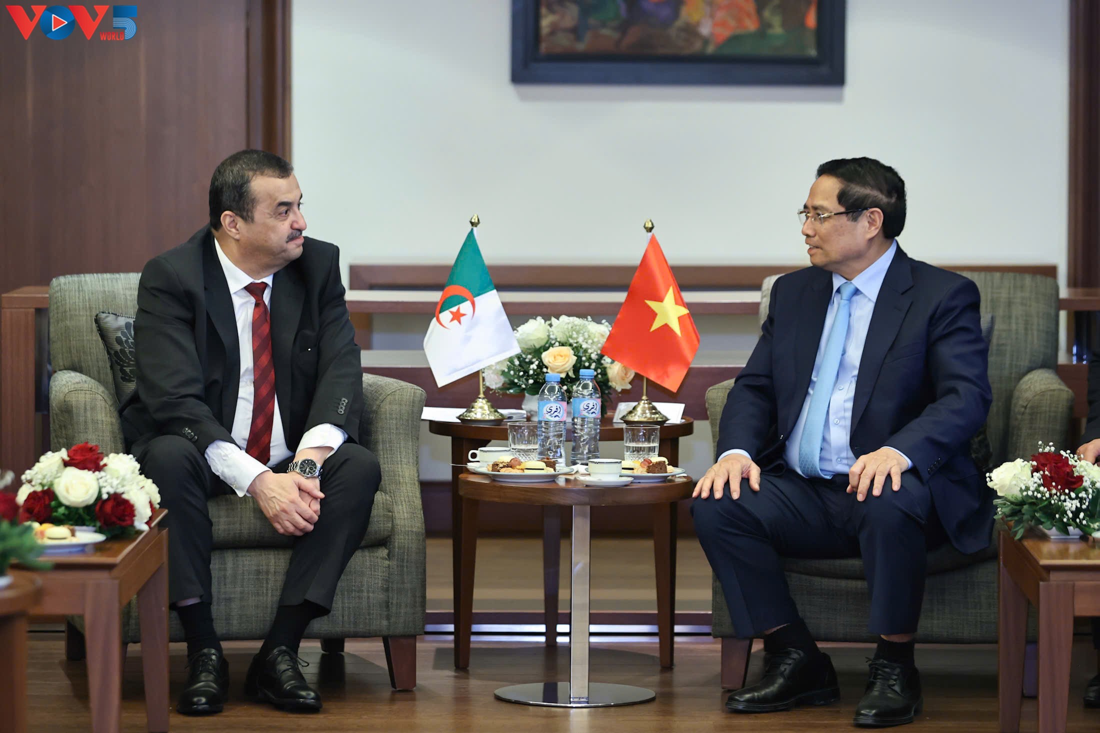 នាយករដ្ឋមន្ត្រី លោក ហ្វាម មិញជីញ បានជួបពិភាក្សាការងារជាមួយរដ្ឋមន្ត្រី ប្រេងកាតនិងរ៉ែអាល់ហ្សេរី លោក Mohamed Arkab (រូបថត៖ VOV) |