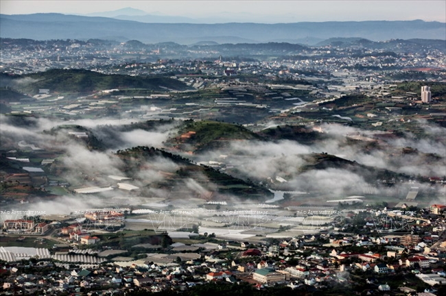 | ទីក្រុងដាឡាតស្រអាប់ក្នុងទឹកសន្សើមរួមមានផ្ទះកញ្ចក់ដាំបន្លែនិងផ្កាដោយបច្ចេកវិទ្យាខ្ពស់មើលពីកំពូលភ្នំកម្ពស់ ១៩៥០ ម៉ែត្រ។ |