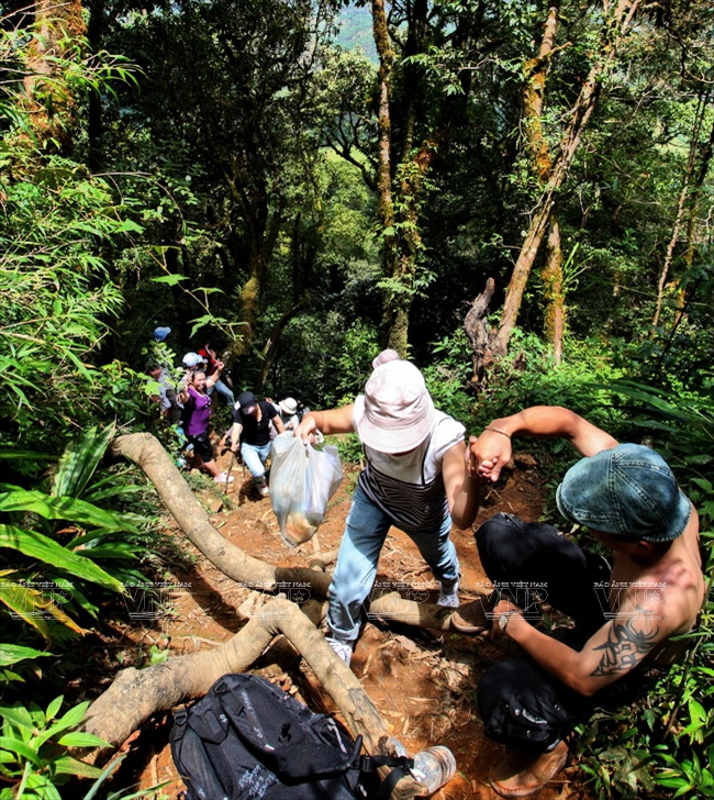 | ភ្ញៀវទេសចរណ៍ឆ្លងកាត់ព្រៃធម្មជាតិក្នុងដំណើរជំនះលើកំពូលភ្នំកម្ពស់ ២១៦៩ ម៉ែត្រ។ |
