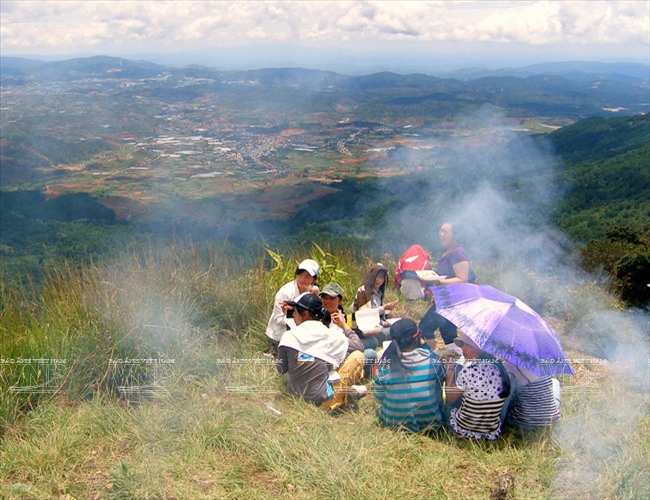 | ភ្ញៀវទេសចរណ៍សំរាកនិងពិសាអាហារពេលថ្ងៃត្រង់ក្នុងដំណើរជំនះ ដល់កំពូលភ្នំ Lang Biang ។ |
