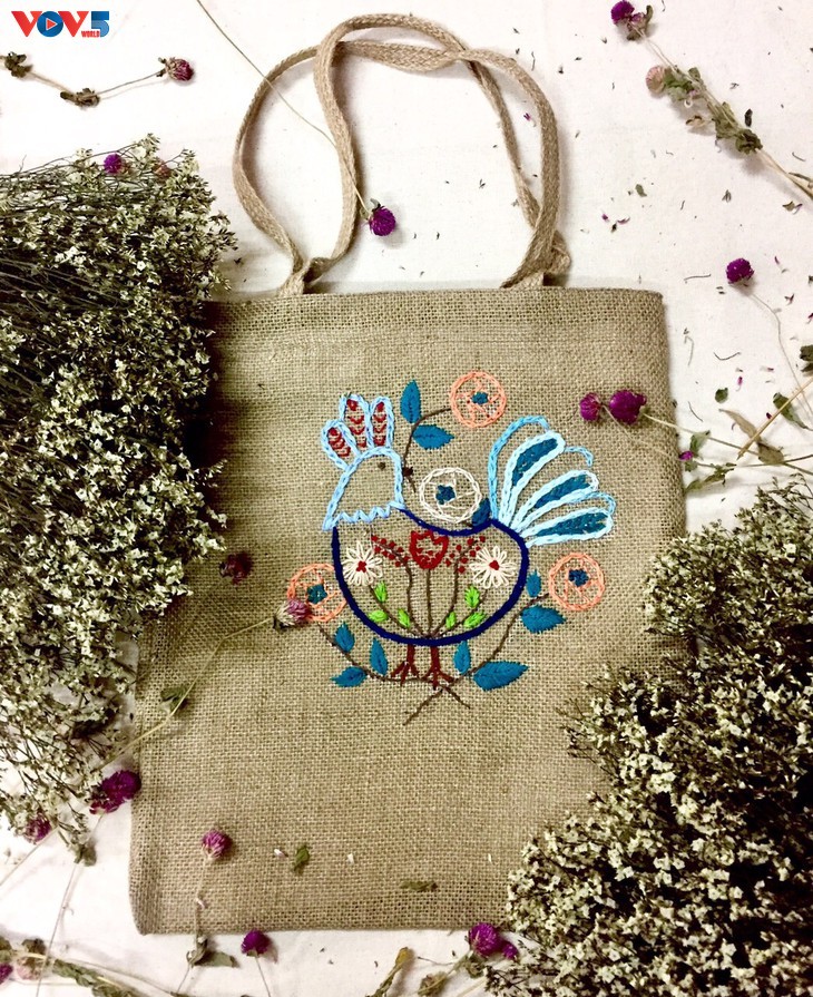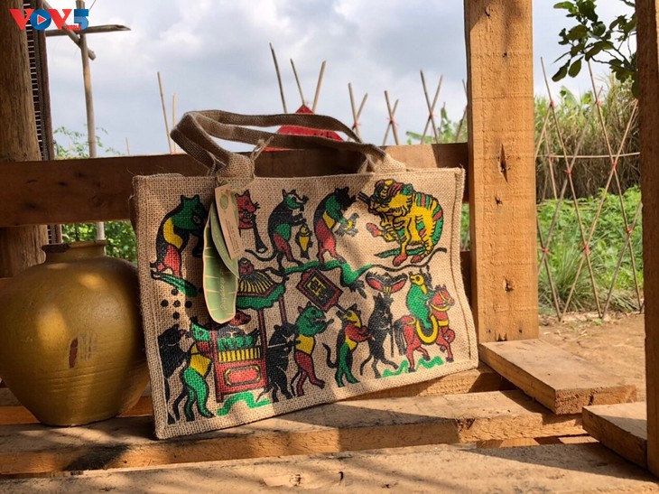 នារីពីរនាក់បាន "ស្លៀកពាក់អាវថ្មី" សម្រាប់ក្រណាត់ធ្វើពីដើមឆ្មៃ ដោយប្រែទៅជាកាបូបស្អាតទាន់សម័យ។ នៅក្នុងនោះ មានកាបូបដែលរចនាឡើងដោយផ្អែកលើការបំផុសគំនិតពីគំនូរប្រជាប្រិយ Dong Ho។