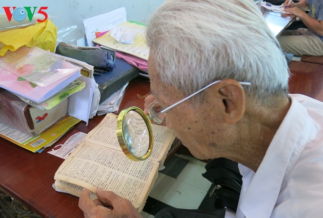 លោក Duong Van Ngo ដៃម្ខាងកាន់កែវពង្រីកមើលអក្សរដៃម្ខាងទៀតសរសេរសំបុត្រ។ ក្នុងរយៈពេលរាប់សិបឆ្នាំកន្លងទៅនេះលោកតាវ័យ៨៧ឆ្នាំធ្វើការនៅក្បែរស្លាកមានសរសេរអក្សរ”កន្លែងណែនាំនិងជួយសរសេរសំបុត្រ”។ នៅជំវិញលោកតែងតែមានមនុស្ស៣ ៤នាក់អង្គុយចាំពឹងលោកជួយសរសេរជាភាសាអង់គ្លេសនិងភាសាបារាំង។ ថ្ងៃមួយអ្នកស្រី Ho Thi Hong នៅសង្កាត់ទី៧ខណ្ឌទី៨បានមករកលោកតា Duong Van Ngo តាំងពីព្រឹកព្រលឹមដើម្បីសូមតាជួយពន្យល់ពីរឿងកាតប៉ុស្តាល់ដែលគេផ្ញើមកជូនអ្នកស្រីពីសហរដ្ឋអាមេរិក។