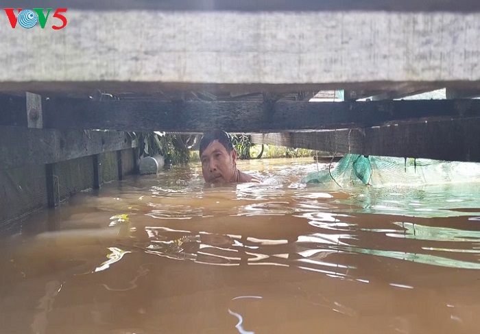 លោក Bay Bon កំពុងត្រួតពិនិត្យទ្រុងបែរចិញ្ចឹមត្រី (រូបថតៈ Tan Phong/VOV)