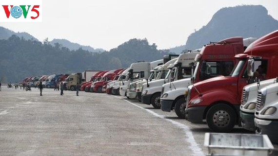 ជួររថយន្តកុងតឺន័រដ៏វែងដឹកផលិតផលកសិកម្មដែលបានកកស្ទះនៅច្រកព្រំដែន (រូបថត៖ VOV) |
