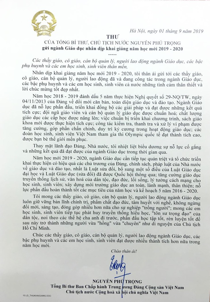 សារលិខិតរបស់អគ្គលេខាបក្ស ប្រធានរដ្ឋវៀតណាម លោក Nguyen Phu Trong ផ្ញើទៅកាន់ស្ថា ប័នអប់រំនានាក្នុងឱកាសបើកបវេសកាលឆ្នាំសិក្សាថ្មី ២០១៩-២០២០។ |