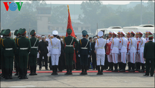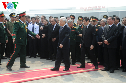 ![]() ថ្នាក់ដឹកនាំកំពូលជម្រាបលានាយឧត្តមសេនីយ៍ Vo Nguyen Giap នៅព្រលានយន្តហោះអន្តរជាតិNoi Bai |