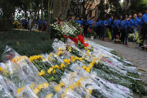 ![]() ប្រជាជនមួយចំនួន បានយកផ្កាមកដាក់នៅក្បែររបងខាងក្រៅ។ |