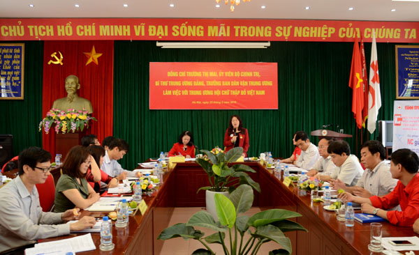 | ទិដ្ឋភាពនៃជំនួបធ្វើការរបស់ប្រធានគណៈកម្មាធិការចលនាមជ្ឈឹមប្រជា ជនជាមួយមជ្ឈឹមសមាគមកាកបាទក្រហមវៀតណាម |