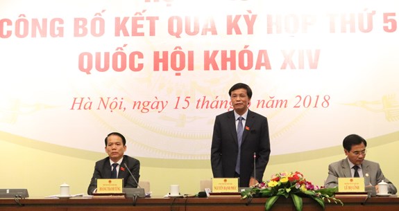 (VOVWORLD) - 6 월 15 일 오후 응웬하잉푹 (Nguyễn Hạnh Phúc) 국회 총비서 겸 사무처장은 제 5 차 국회 총회 결과를 발표하는 기자 회견을 주재했다. 제 5 차 국회 총회 결과는 입법, 국가의 중요한 결정과 감독 등의 활동에 관한 여러 가지 중요한 내용을 담은 의사일정을 완성했다.