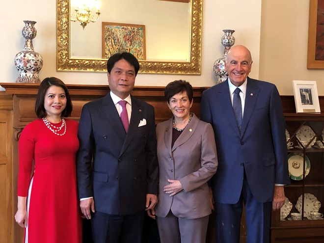 (VOVWORLD) - 근래 수도 웰링턴 정부청사에서 Patsy Reddy 뉴질랜드 총독과 부군은 임기를 마치고 이임 인사 차 예방한 Nguyen Viet Dung 대사와 부인을 맞이하고 친밀한 면담을 가졌다. 회의에서 뉴질랜드 총독은 Nguyen Viet Dung대사가 경제무역, 외교정치 부문에서 양국관계를 공고하게 강화하고, 교육, 의학, 관광, 농업 등 양측이 수요가 있고 우위와 우선순위를 갖춘 부문에서 협력한 노력을 높이 평가하였다.