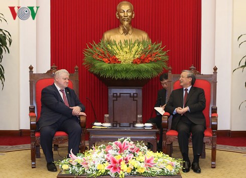 (VOVWORLD) - 4월17일 중앙당 청사에서 Tran Quoc Vuong정치부위원 겸 사무국상임 겸 중앙감찰위원회 주임은 중앙공산당 초청으로 베트남을 공식 방문 중인 Sergey Mikhailovich Mironov 단장을 비롯한 공정러시아당 고위급 대표단을 접견했다.