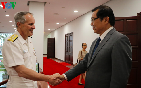 (VOVWORLD) - 3월5일 저녁 다낭시 Tien Sa 항구에 도착하여 3월 5일부터 9일까지 다낭시를 우정방문을 시작하면서 미국 대평양 함대 제7 함대 사령관 Philip G. Sawyer 부제독은 미국해군함팀 지휘관과 함께 다낭시 지도자들을 예방했다.