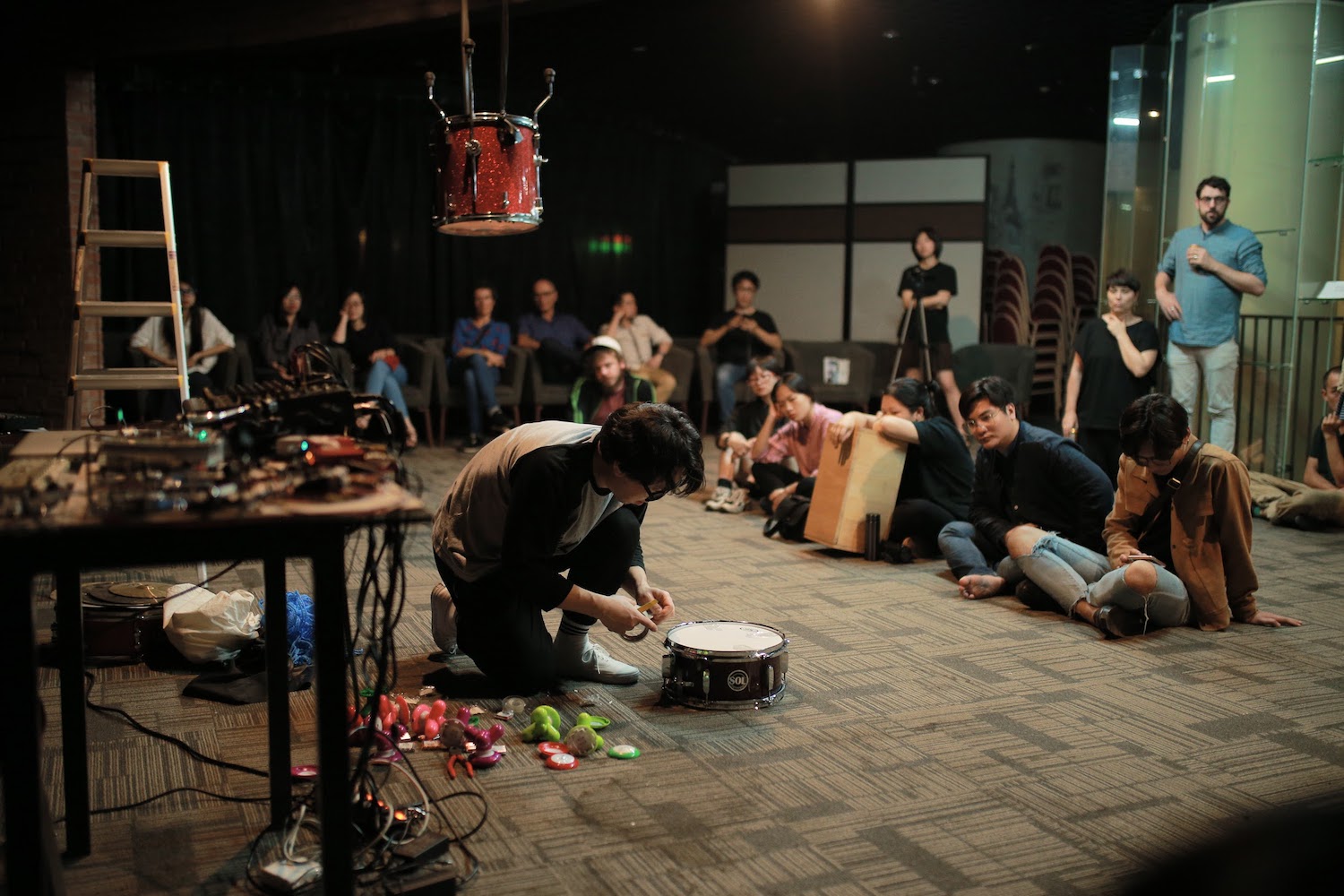 (VOVWORLD) - 다른 불빛이 없이 음향조절기기에서 흘러나오는 약한 불빛밖에 없는 공간 속에서 관객들은 구체적인 곡조도 없는 소리를 집중해서 들었다. 한편 아티스트들이 관객들앞에서 직접 사닥다리를 사용하여 공연 도구를 설치하고 있었다. 이는 일반적인 음악 공연 밤에서 볼 수 없을 것 같은 장면들이지만 이러한 요소들이 기존과 차별되는 독특한 음악공연을 만들어 주고 있었다.
