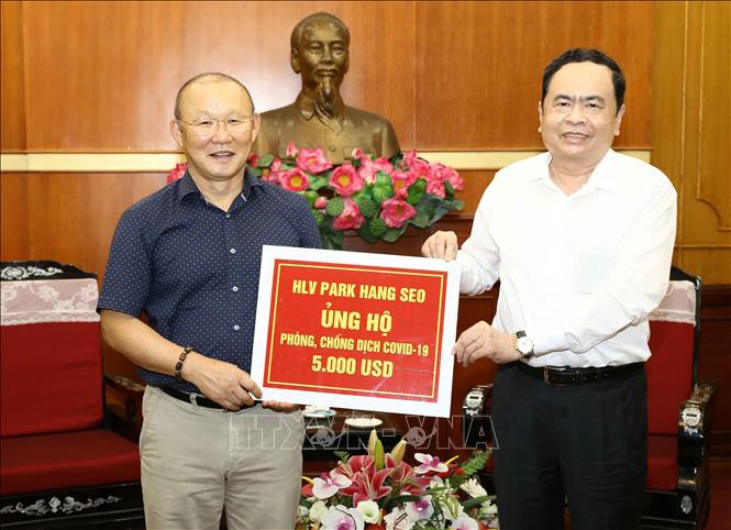 (VOVWORLD) - 3월 26일 하노이에서 베트남 조국전선중앙위원회 쩐 타인 먼 (Trần Thanh Mẫn) 위원장은 베트남 국가 축구팀 박항서 감독으로부터 코로나 19 방역 지원금 5천 달러를 받았다.