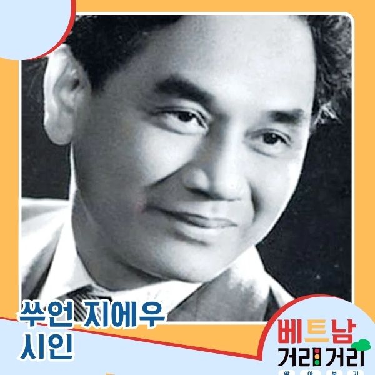 뚱응옥: 자, 이번에는요, 이 아름다운 거리의 이름이 된 주인공이죠. 바로 시인 쑤언 지에우에 대해 소개해 드릴까 합니다. 본명이 응오 쑤언 지에우(Ngô Xuân Diệu, 1916~1985년)인 그는, 남중부 자라이(Gia Lai)성 고보이(Gò Bồi)라는 어머니의 고향에서 태어났지만, 원래 뿌리는 중부 하띤성 짜오냐(Trảo Nha) 마을에 두고 있어요. 굳세고 강인한 베트남 중부의 핏줄과, 자유롭고 탁 트인 남부의 흙내음이 만나 아주 다채롭고 열정 넘치는 예술가의 영혼을 탄생시킨 셈이죠. 1937년 후에(Huế)에서 고등학교 졸업 시험을 마친 그는, 하노이로 올라와 법학을 공부하며 당시 가장 진보적인 문학 단체였던 ‘뜨륵반도안(Tự Lực Văn Đoàn, 자력문단)’에 합류하게 됩니다.