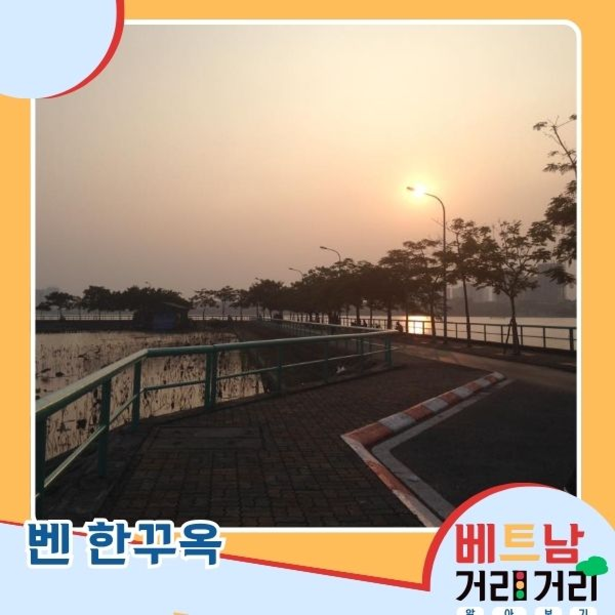 홍응옥: 그리고 우리 한국 청취자 여러분이라면 관심을 가질 만한 장소도 바로 근처에 있습니다. 바로 벤 한꾸옥(Bến Hàn Quốc), 즉 ‘한국 선착장’이라고 불리는 곳인데요. 서호를 빙 둘러싼 둑길의 한 구간을 부르는 친근한 이름입니다. 탁 트인 공간과 다채로운 색감의 그래피티로 아주 유명하죠. 낭만적이고 시원한 분위기 덕분에 하노이 청년들이 바람을 쐬러 자주 찾는 핫플레이스이기도 합니다. 가는 길을 살짝 알려드리자면, 쑤언지에우 길에서 또응옥번(Tô Ngọc Vân) 52번 골목으로 꺾어 들어가서요, 그 작은 골목 끝까지 쭉 가신 다음, 호숫가로 이어진 오솔길을 따라가시면 됩니다. 가는 길이 조금 구불구불하고 바닥도 살짝 울퉁불퉁하지만, 그 수고로움 끝에는 호수에서 불어오는 시원한 바람과 끝없이 펼쳐진 연꽃밭, 그리고 마치 영화 속 한 장면 같은 아름다운 일몰이 여러분을 기다리고 있을 겁니다.