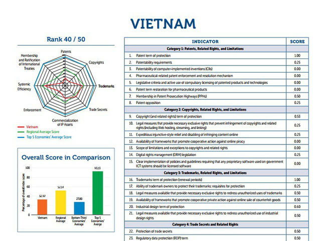 (VOVWORLD) - AmCham (미국 상공회의소) 산하 글로벌지식재산센터(GIPC)는 “Create”라는 명칭으로 ‘6차 년간 국제지식재산지수’를 발표하며 세계 50개국의 지식재산 현황을 분석하였다.