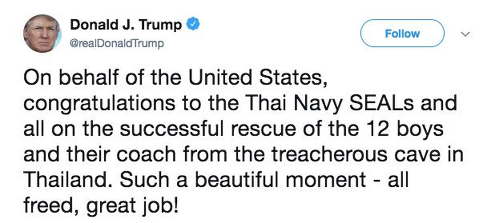도널드 트럼프 미국 대통령은 태국 네니비실이 구조 노력을 주도한 것을 축하하는 최초의 국가 중 하나다. 개인 트위터 페이지에서 트럼프 대통령은 동굴에서 12 명의 팀원과 코치를 성공적으로 구출하는 것이 아름다운 순간이며 작전이 훌륭하게 완료되었다고 말했다.