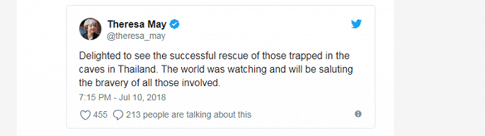 한편 테레사 메이(Theresa May) 영국 총리도 트위터에서 동굴에 갇힌 팀원들을 구해 줘서 기쁘게 생각하고 전 세계가 이 사건을 지켜 봤으며 구조에 참여한 모든 사람들의 용기를 항상 기억할 것이라고 강조했다.