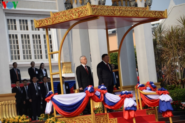 | 분낭 보라치트 라오스 인민민주주의공화국 서기장-국가주석은 라오스 인민민주주의공화국 공식 우호방문 중인 응우옌 푸 쫑 서기장-주석과 베트남 고위급 대표단 환영식을 주재하였다. |