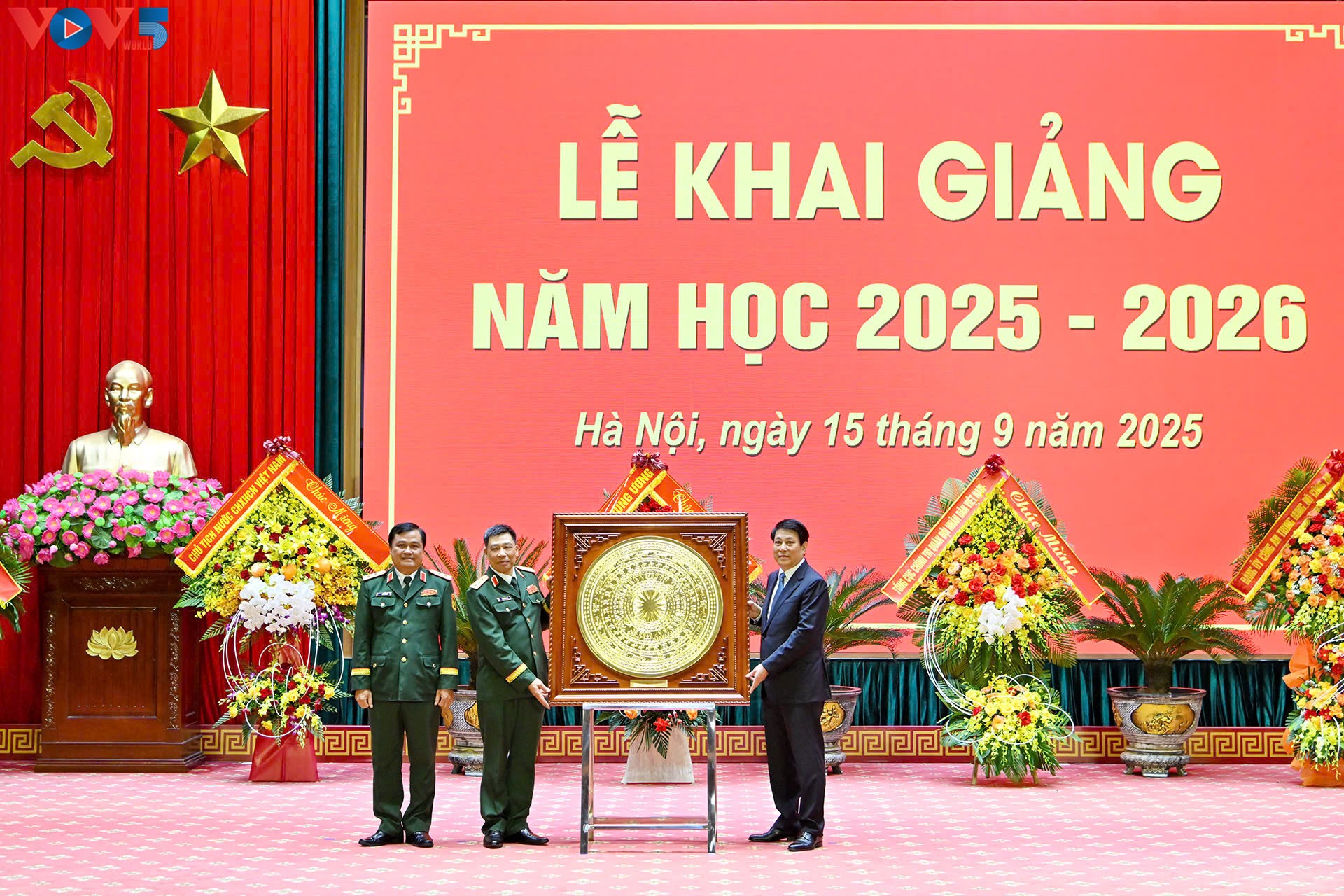 (VOVWORLD) - ຕອນເຊົ້າວັນທີ 15 ກັນຍາ, ທ່ານປະທານປະເທດ ຫວຽດນາມ ເລືອງເກື່ອງ ໄດ້ມາຢ້ຽມຢາມ ແລະ ເຂົ້າຮ່ວມພິທີເປີດສົກຮຽນໃໝ່ 2025 – 2026 ຢູ່ວິທະຍາຄານປ້ອງກັນຊາດ ທີ່ນະຄອນຫຼວງ ຮ່າໂນ້ຍ.