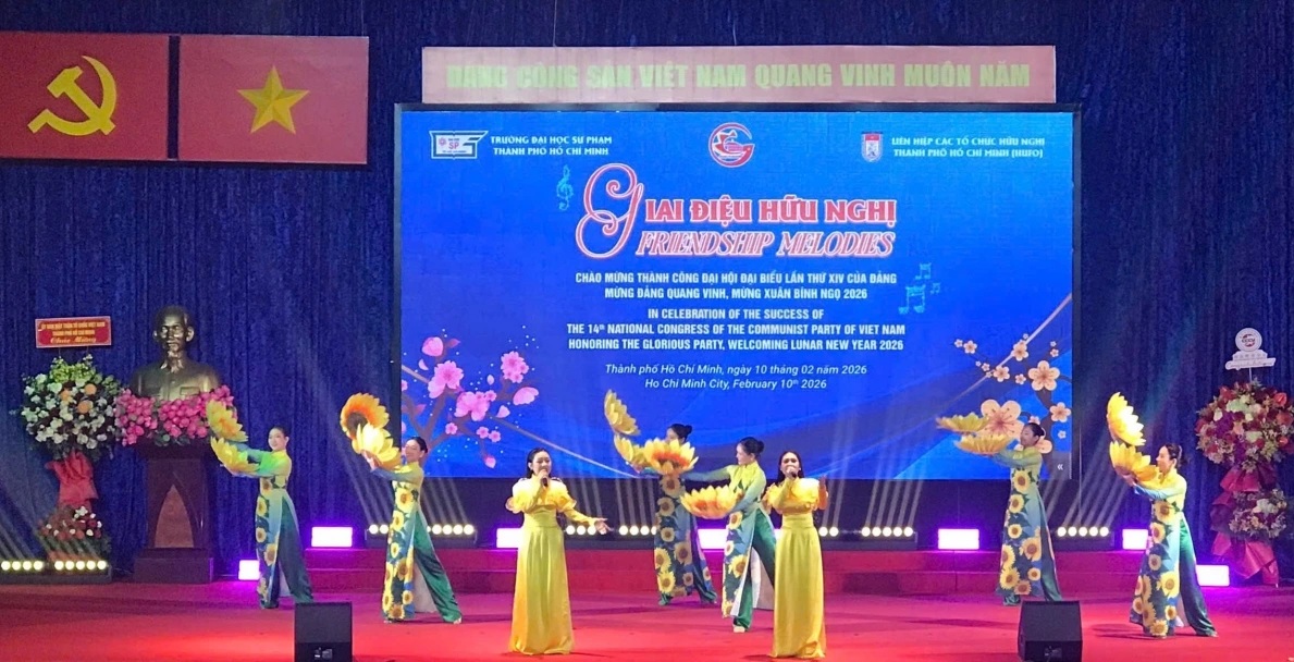 (VOVWORLD) - ລາຍການສະແດງສິລະປະ “ທຳນອງເພງມິດຕະພາບ” ໄດ້ດຳເນີນໃນຕອນຄ່ຳວັນທີ 10 ກຸມພາ ຢູ່ນະຄອນ ໂຮ່ຈີມິນ, ປະກອບສ່ວນແຜ່ກະຈາຍນ້ຳໃຈສາມັກຄີ, ມິດຕະພາບສາກົນ, ຊົມເຊີຍຜົນສຳເລັດກອງປະຊຸມໃຫຍ່ຜູ້ແທນທົ່ວປະເທດຄັ້ງທີ XIV ຂອງພັກ ແລະ ຕ້ອນຮັບລະດູບານໃໝ່ປີມະເມຍ 2026.