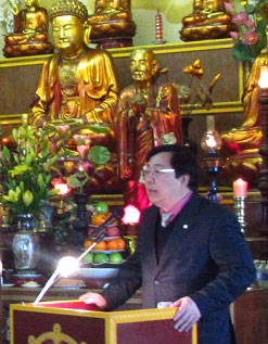 ພິທີບວດພະແກ້ວໃຫຍ່ສຸດຢູ່ຝລັ່ງ ໂດຍແມ່ນສາສະນິກະຊົນ ດັ້ງທິບີກຮ່ວາ ຜູ້ອຳນວຍການໃຫຍ່ບໍລິສັດຫຸ້ນສ່ວນໄປສະນີດ່ວນຫວຽດນາມ ເຄນຖະຫວາຍໃຫ້ແກ່ວັດຈຸກເລີມ