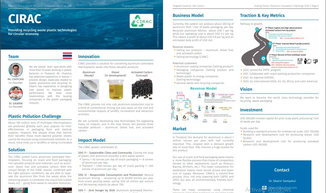 (VOVWORLD) - ໂດຍເປັນໜຶ່ງໃນ 4 ທິມທີ່ໄດ້ຮັບໄຊຊະນະໃນການເສັງທົດສອບປະດິດຄິດສ້າງຫຼຸດຜ່ອນຢາງພະລາດສະຕິກເສດເຫຼືອ (EPPIC) 2020 ໂດຍ ອົງການພັດທະນາ ສປຊ ສົມທົບກັບບັນດາປະເທດ ອາຊຽນ (UNDP) –ຈັດຕັ້ງຂຶ້ນຫວ່າງມໍ່ໆມານີ້, ທິມ CIRAC ຂອງ ໄທ ໄດ້ນຳສະເໜີເຕັກໂນໂລຢີໜຶ່ງທີ່ມີລັກສະນະບຸກທະລຸ. ນັ້ນແມ່ນ ເຕັກໂນໂລຢີຫັນປ່ຽນຖົງຫຸ້ມຫໍ່ snack ໃຫ້ກາຍເປັນອາລູມີນຽມແລະ ນ້ຳມັນກາຊວນ. ເຖິງວ່າໂຄງການດັ່ງກ່າວກຳລັງຢູ່ໃນຂັ້ນຕອນທົດລອງກໍຕາມ ແຕ່ໄດ້ໃຫ້ໝາຍຜົນທີ່ມີຄວາມເປັນໄປໄດ້ພໍສົມຄວນ, ດ້ວຍສະມັດຕະພາບບຳບັດຖົງຫຸ້ມຫໍ່ snack 1000 ໂຕນ ເປັນ ອາລູມີນຽມ 200 ກິໂລກະຣາມ ຕໍ່ວັນ, ອັນໄດ້ປະກອບສ່ວນຫຼຸດຜ່ອນຢາງພະລາດສະຕິກເສດເຫຼືອ ແລະ ຊຸກຍູ້