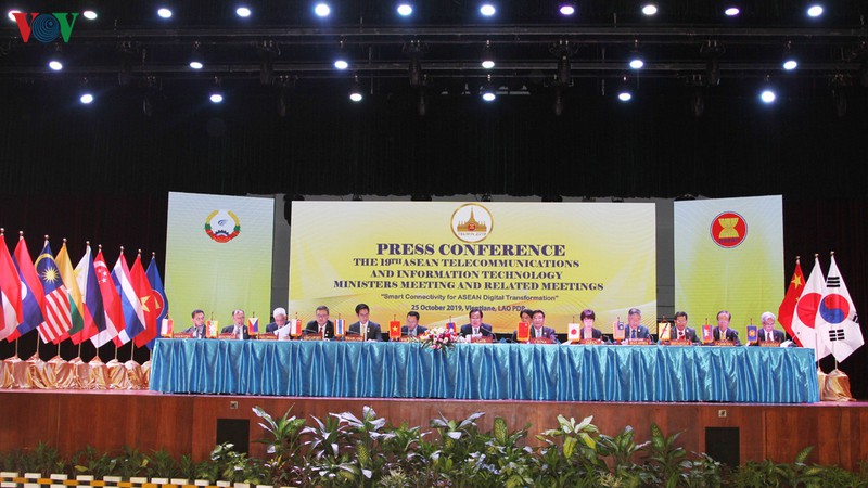 (VOVWORLD) - ພາຍຫລັງເຮັດວຽກມາເປັນເວລາ 2 ວັນ, ຕອນບ່າຍວັນທີ 25 ຕຸລາ, ຢູ່ນະຄອນຫລວງ ວຽງຈັນ, ປະເທດ ລາວ, ກອງປະຊຸມລັດຖະມົນຕີກະຊວງຖະແຫຼງຂ່າວ ແລະ ສື່ສານ ອາຊຽນ ຄັ້ງທີ 19 (TELMIN 19) ໄດ້ອັດລົງ. ທ່ານ ທັນສະໄໝ ກົມມະສິດ ລັດຖະມົນຕີກະຊວງໄປສະນີໂທລະຄົມມະນາຄົມ ແລະ ການສື່ສານ ລາວ ເປັນປະທານກອງປະຊຸມຖະແຫຼງຂ່າວ ກ່ຽວກັບຜົນສຳເລັດຂອງກອງປະຊຸມ.