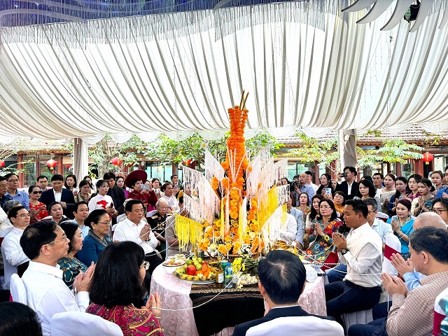 (VOVWORLD) - ບັນດາຜູ້ແທນ, ແຂກຖືກເຊີນ ໄດ້ຮັບຊົມບັນດາລາຍການສະແດງສິລະປະໂດຍນັກສຶກສາລາວ ສະແດງ, ເຂົ້າຮ່ວມພິທີບາສີສູ່ຂວັນ, ມັດແຂນ ແລະ ຮັບປະທານອາຫານທີ່ເປັນເອກະລັກຂອງລາວ ອີກດ້ວຍ. ນອກຈາກນັ້ນແລ້ວ, ແຂກຖືກເຊີນຍັງໄດ້ເຊື່ອມຕົວເຂົ້າກັບສຽງຂັບ, ສຽງລຳ, ການຟ້ອນລຳວົງ ແລະ ຫົດນ້ຳອວຍພອນເຊິ່ງກັນ ແລະ ກັນ, ເຊິ່ງເປັນໜຶ່ງໃນບັນດາຈຸດວັດທະນະທຳທີ່ເປັນເອກະລັກໃນ ບຸນປີໃໝ່ ລາວ.
