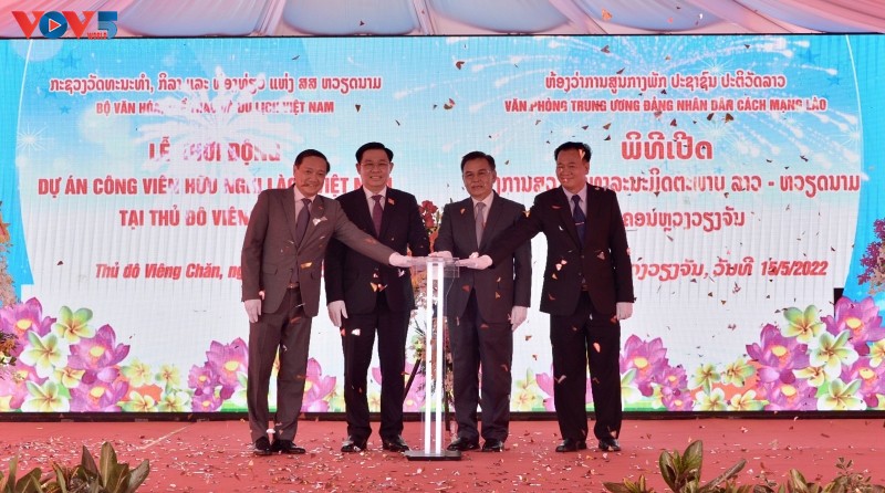 (VOVWORLD) -ໃນຂອບເຂດການຢ້ຽມຢາມ ລາວ ຢ່າງເປັນທາງການ, ຕອນບ່າຍວັນທີ 15 ພຶດສະພາ, ຢູ່ນະຄອນຫຼວງ ວຽງຈັນ, ທ່ານປະທານສະພາແຫ່ງຊາດ ຫວຽດນາມ ເວືອງດິ່ງເຫວ້ ແລະ ທ່ານປະທານສະພາແຫ່ງຊາດ ລາວ ໄຊສົມພອນ ພົມວິຫານ ໄດ້ເຂົ້າຮ່ວມ ພິທີເປີດໂຄງການສວນສາທາລະນະມິດຕະພາບ ລາວ - ຫວຽດນາມ.