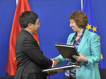ວັນທີ 27/6, ຢູ່ Brussel ປະເທດແບນຊິກ, ທ່ານ Pham Binh Minh ລັດຖະມົນຕີການຕ່າງປະເທດຫວຽດນາມ ແລະ ທ່ານນາງ Catherine Ashton ກຳມະການຂັ້ນສູງ ຮັບຜິດຊອບນະໂຍບາຍຄວາມໝັ້ນຄົງ ແລະ ການຕ່າງປະເທດຂອງສະຫະພາບເອີລົບ (EU) ໄດ້ລົງນາມໃນສັນຍາຄູ່ຮ່ວມມື ແລະ ຮ່ວມມືຮອບດ້ານລະຫວ່າງຫວຽດນາມ-EU (PCA)