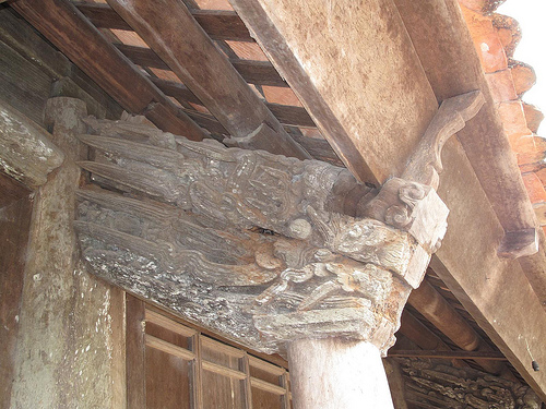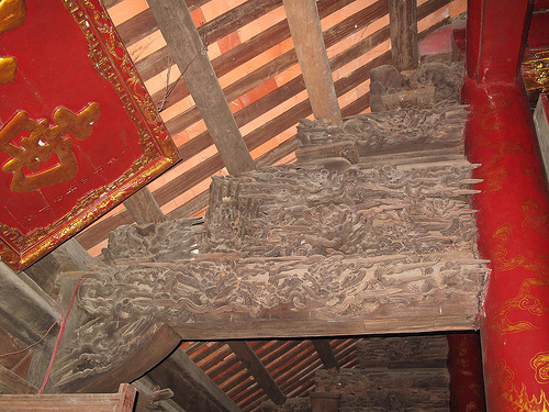 ສະຖາປັດຕະຍະກຳຂອງສາລາໝູ່ບ້ານທະເລນີ້ ໄດ້ສ້າງຄວາມປະທັບໃຈໃຫ້ແກ່ນັກທ່ອງທ່ຽວ ດ້ວຍສິລະປະແກະຄວັດສະຫລັກຢ່າງລະອຽດລະອໍ. ຮູບແກະຄວັດສະຫລັກຢູ່ທີ່ນີມີ: ສັດ tu linh, ມັງກອນສອງໂຕເຝົ້າພະຈັນ, ປາໄນກາຍເປັນມັງກອນ, ກ້ອນເມກ… ຈຸດພິເສດຢູ່ສາລານີ້ແມ່ນປະຕູໃຫຍ່ທີ່ແກະຄວັດສະຫລັກຮູບເທວະດາຂີ່ມັງກອນຂ້າມທະເລ.
