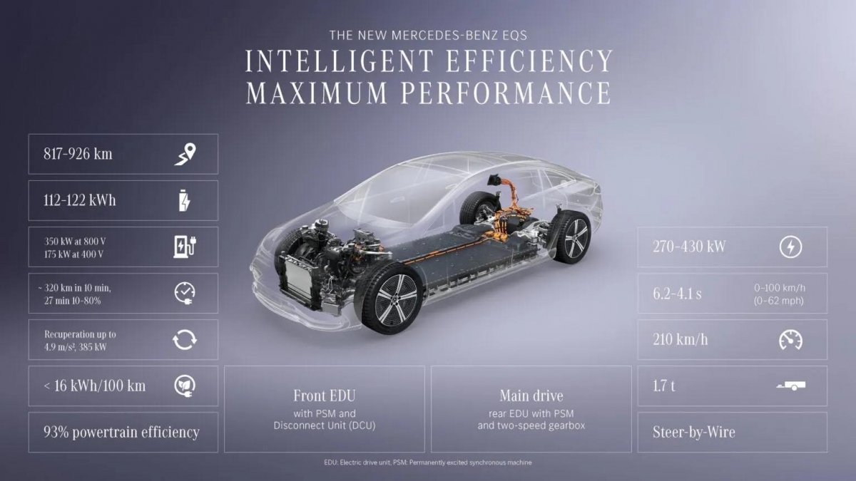 Dung lượng pin chỉ tăng nhẹ khoảng 3%, nhưng hiệu suất tổng thể lại được tối ưu đáng kể, giúp phạm vi hoạt động tăng khoảng 13%. Nhờ đó, EQS mới có thể đạt quãng đường di chuyển ấn tượng, tiệm cận mốc hơn 900 km theo tiêu chuẩn WLTP trong điều kiện lý tưởng.