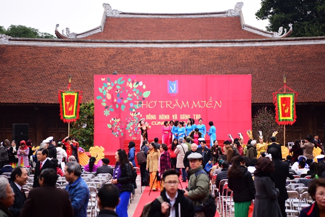 (VOVworld) – В рамках празднования 60-летия со дня создания Союза вьетнамских писателей, 11 февраля (т.е. 15 января по лунному календарю) в Храме литературы Ванмиеу-Куоктызям в Ханое прошел 15-й День вьетнамской поэзии на тему «Инициатива во имя развития Отечества». В рамках 15-го Дня вьетнамской поэзии прошли различные мероприятия, воспевающие Родину, Партию, президента Хо Ши Мина и национальное единство, такие как: конкурс сочинения стихов, конкурс чтецов, сочинение стихотворений в подарок.