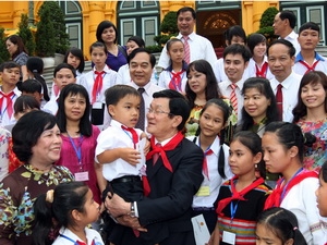 (VOV) - Во второй половине дня 31 мая в Ханое президент СРВ Чыонг Тан Шанг встретился с 50 детьми, находящимися в трудной жизненной ситуации в связи с посещением ими столицы Ханоя и Мавзолея Хо Ши Мина. Все эти ребята, присутствовавшие на этой встрече это- отличники, добившиеся блестящих успехов в учебе в 2011-2012 учебном году.