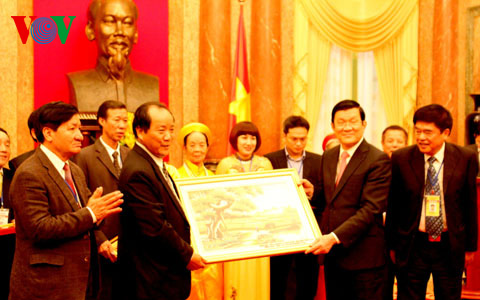 (VOVworld) - 20 марта во второй половине дня президент СРВ Чыонг Тан Шанг провёл встречу с делегацией Ассоциации сельского хозяйства и развития деревни Вьетнама, в состав которой вошли 66 лучших бизнесменов и крестьян, которые добились блестящих успехов в сельскохозяйственном производстве и строительстве новой деревни. На встрече глава государства подчеркнул, что сфера сельского хозяйства страдает от жёсткой конкуренции, поэтому перед ней ставится актуальная задача – осуществить реструктуризацию и внедрить в производство научно-технические новинки для повышения урожайности растениеводства и животноводства, а также для повышения конкурентоспособсности своей продукции. Президент Чыонг Тан Шанг предложил Ассоциации сельского хозяйства и развития деревни Вьетнама проявить инициативу в пропагандистской работе, чтобы ее члены хорошо освоили ситуацию и требования на новом этапе, а также активно защитили интересы крестьян и предприятий в сельскохозяйственном секторе в период международной интеграции страны.
